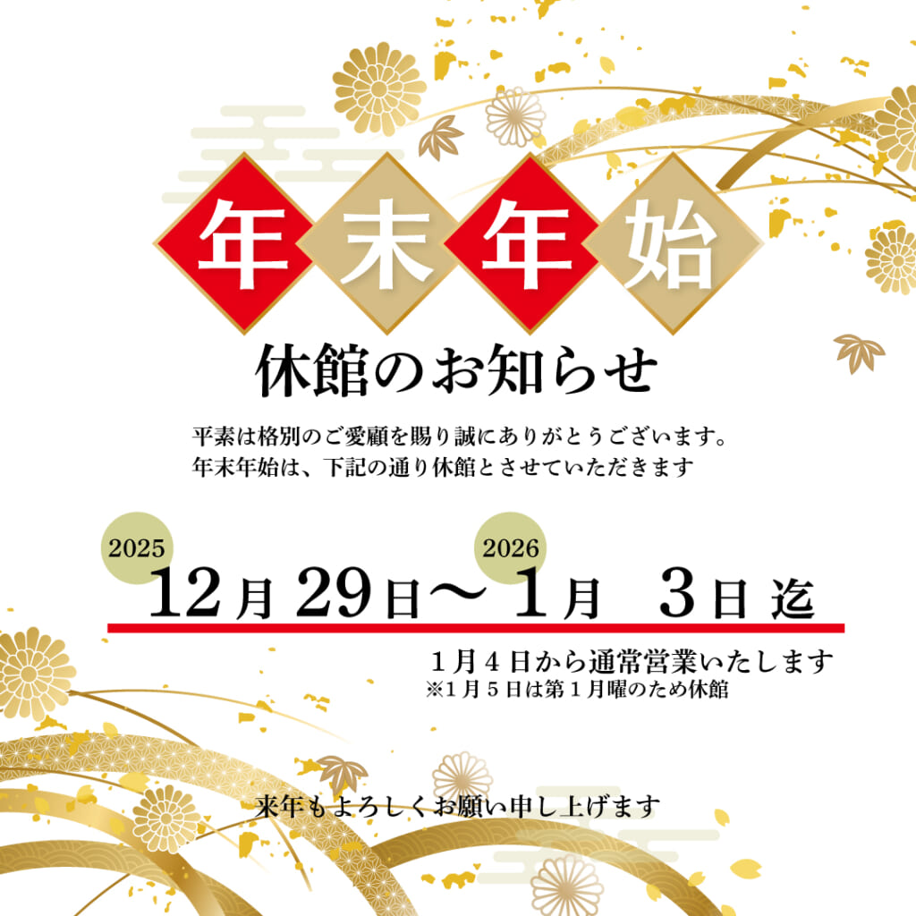 ※年明けは2026年1月4日(日) より通常営業いたします。(2026年1月5日(月)は第1月曜日のため定休日です)